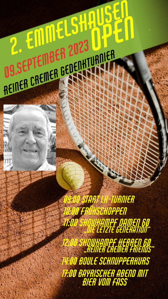 Am Samstag, dem 09.09.2023, finden auf unserer Anlage die 2. Emmelshausen Open statt. Nach dem großartigen Erfolg der ersten Veranstaltung möchten wir dieses Mal noch eins draufsetzen. Als besondere Hommage an unser verstorbenes Ehrenmitglied wird dieser Tag auch als "Reiner Cremer Gedenkturnier" abgehalten.