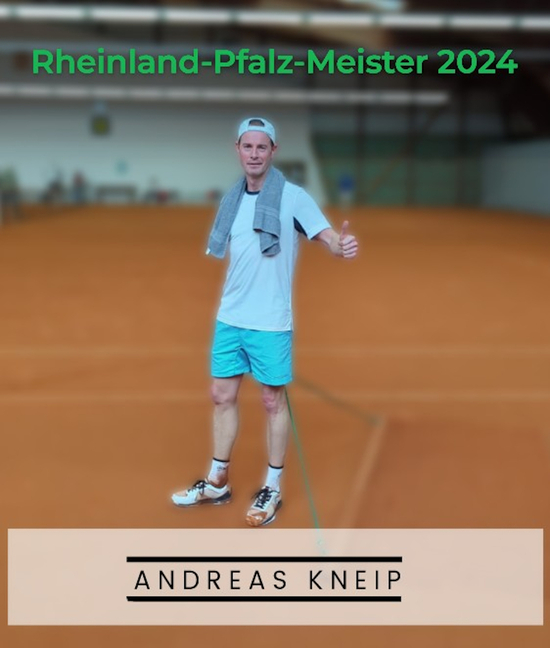 Bei den diesjährigen Rheinland-Pfalz-Hallen-Tennismeisterschaften konnte unser Vereinskollege Andreas Kneip in der Sandplatzhalle des Ingelheimer TC erneut den Meistertitel in der Altersklasse Herren 40 erringen. Aufgrund der relativ wenigen, aber dennoch qualitativ hochwertigen Meldungen wurde in zwei Dreiergruppen gespielt. Dies zeigte sich auch gleich in einem sehr intensiven ersten Match, in dem er gegen Jürgen Doetsch von der SG DJK Andernach, Nr. 138 der deutschen Rangliste, einen Satzrückstand aufholen musste und den Match-Tie-Break hauchdünn mit 11:9 für sich entscheiden konnte. Leider hat dann der zweite Gruppengegner zurückgezogen. So konnte der Samstag zur Erholung genutzt werden und das Finale war bereits erreicht. Dort wartete der an Nummer 1 gesetzte Ralf Adams vom TC Roscheid. Der erste Satz war geprägt von einem ständigen Hin und Her der Führung. Nachdem Andreas beim Stand von 4:5 zwei Satzbälle abwehren konnte und im Tie-Break schnell mit 0:2 zurücklag, konnte er diesen souverän mit 7:2 für sich entscheiden. Nach einem schnellen Break gegen sich im zweiten Satz drückte er bis zum Schluss aufs Gaspedal und gewann diesen klar mit 6:2. Damit holte er sich zum zweiten Mal den Titel, den er bereits im Sommer 2022 für sich gewinnen konnte! Wieder einmal sind wir sehr stolz darauf, dass du unseren Verein so erfolgreich repräsentiert und in der Tenniswelt ein Stück bekannter gemacht hast!